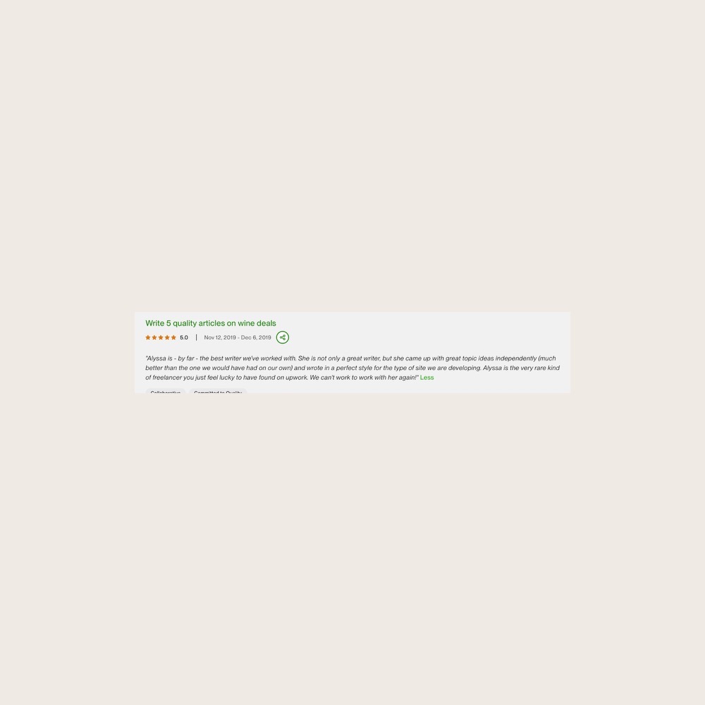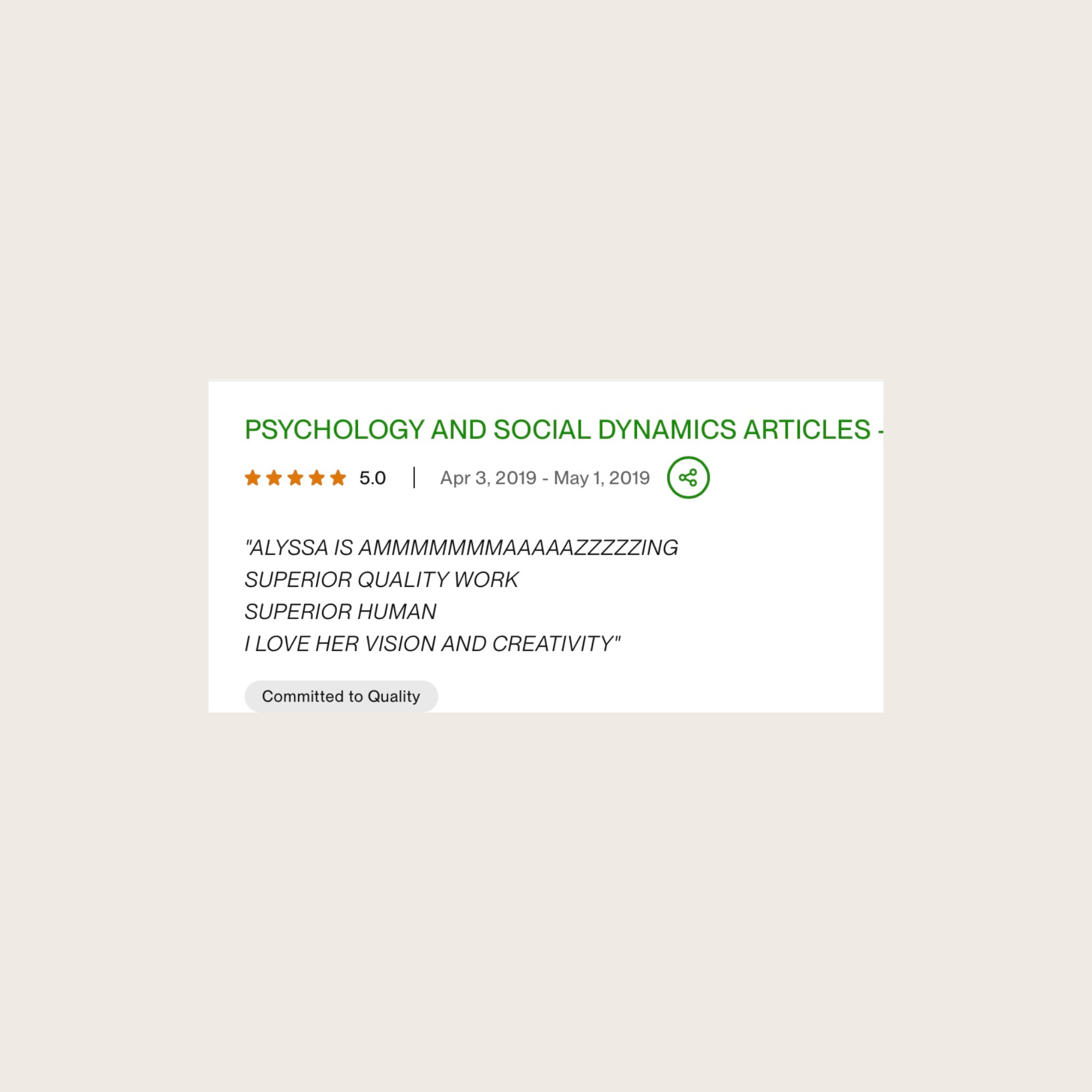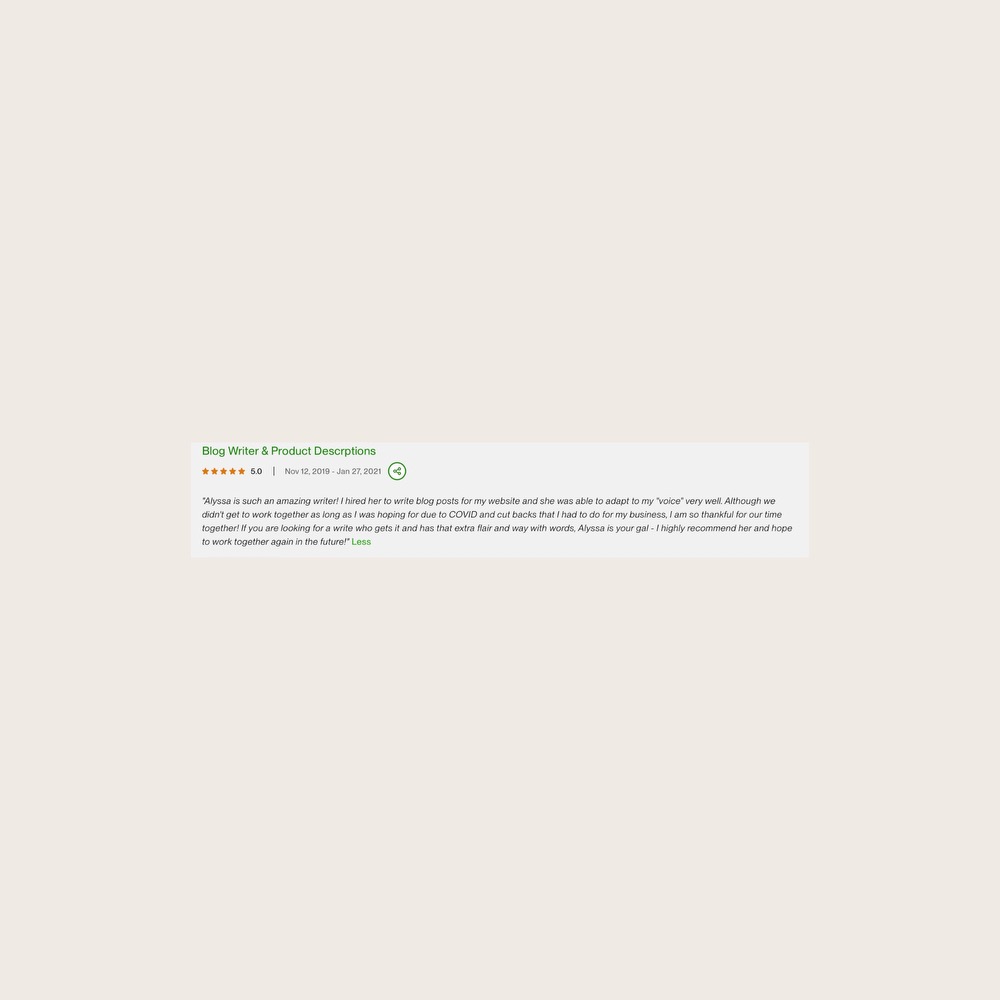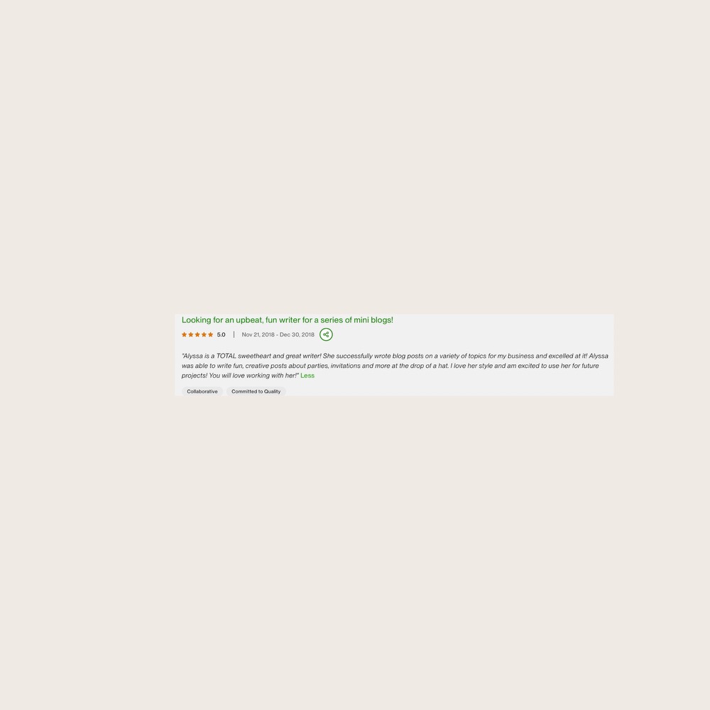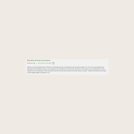 Take a look at what my previous clients have had to say about my work over the years! These reviews showcase the versatility of my voice as a writer and my ability to deliver high-quality content across a diverse range of industries and projects