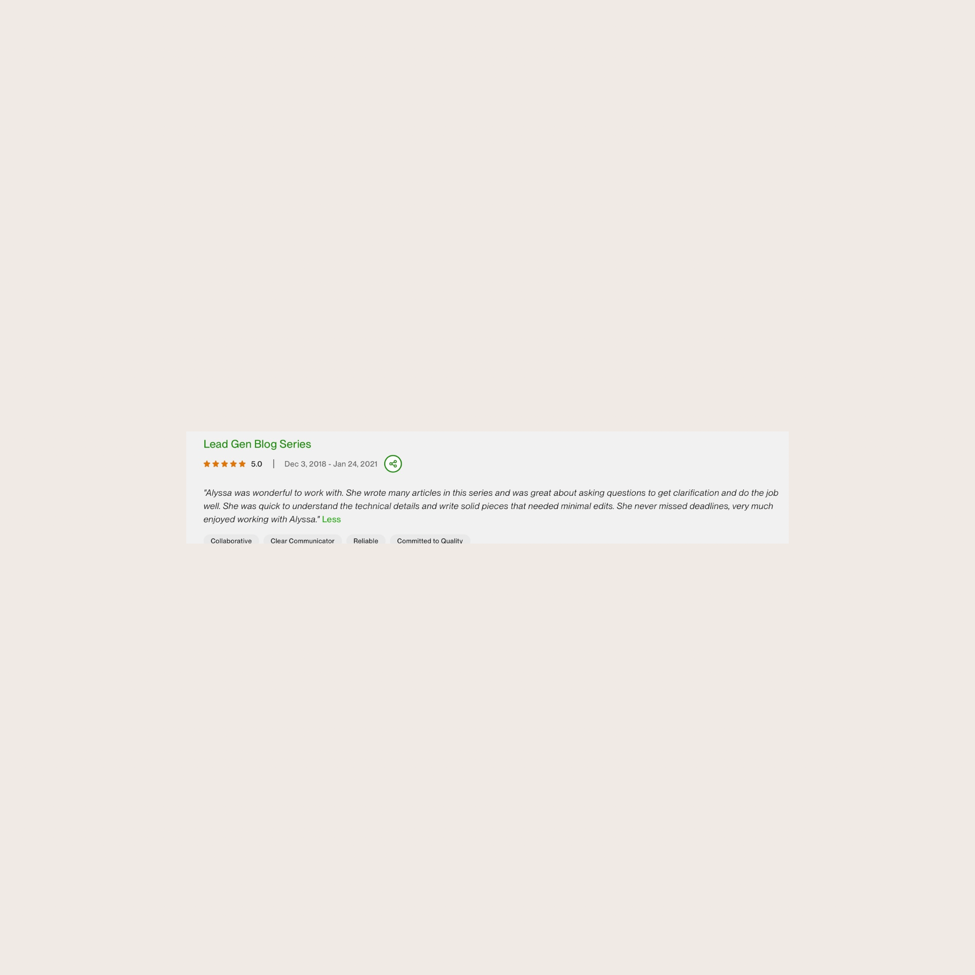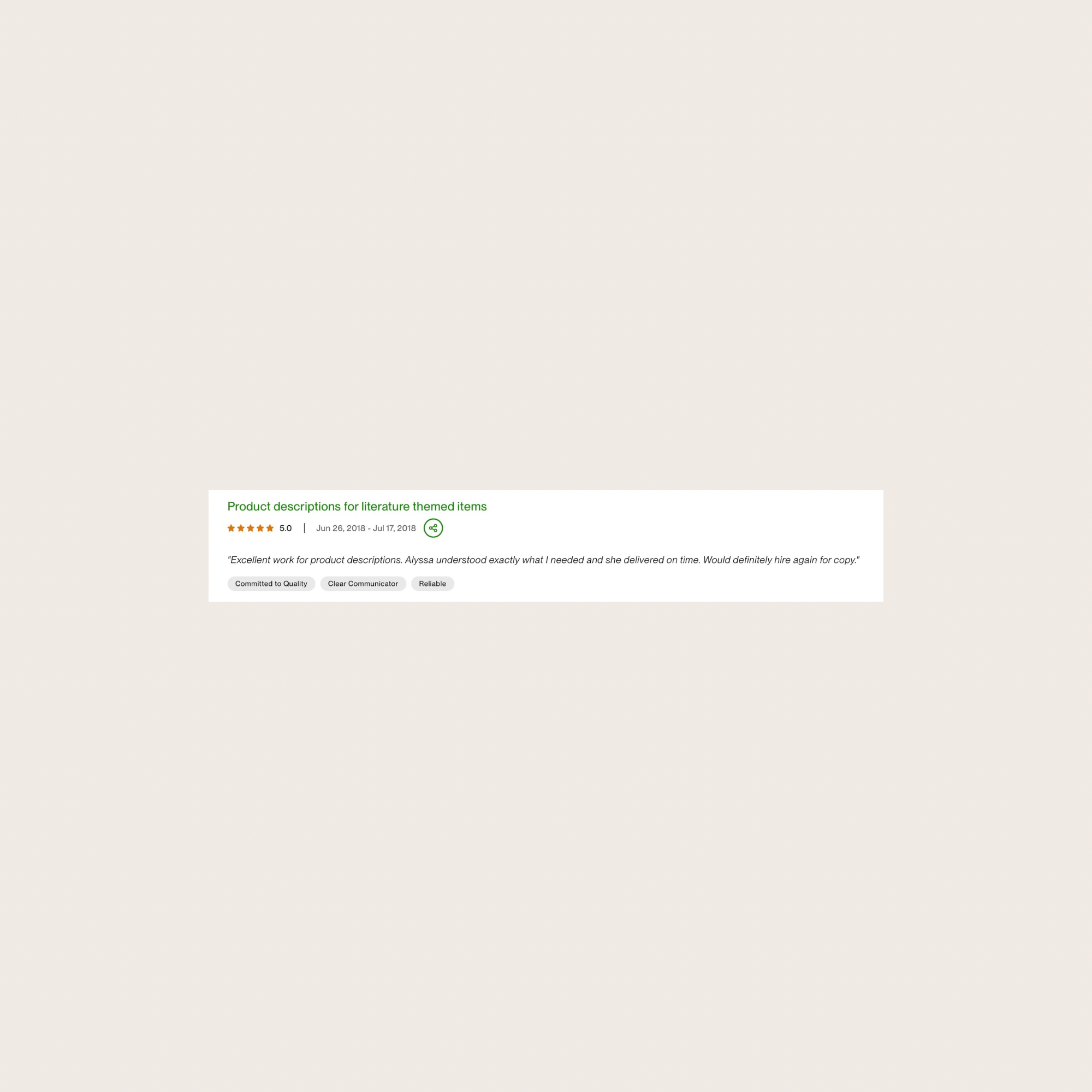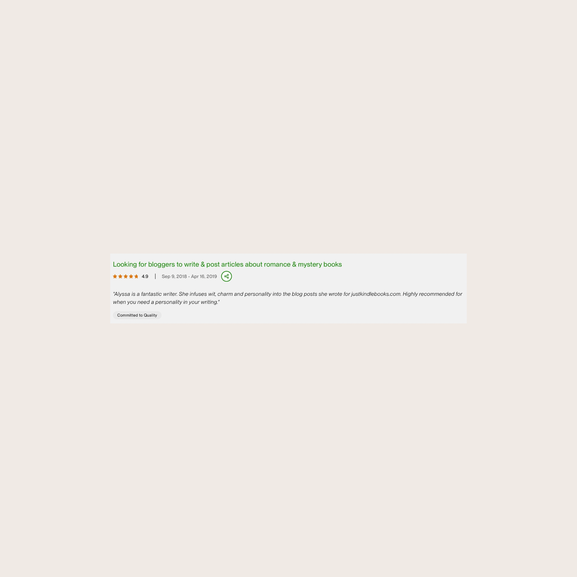 Take a look at what my previous clients have had to say about my work over the years! These reviews showcase the versatility of my voice as a writer and my ability to deliver high-quality content across a diverse range of industries and projects
